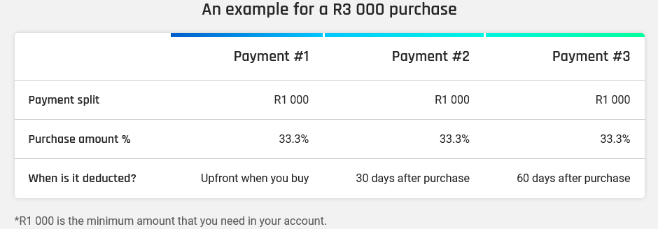 The monthly payment amount displayed on the Payfast page after checkout is based on 12 monthly instalments and excludes Mobicred initiation and service fees. Interest is charged at 18% per year. Please note the annual interest rate may change.